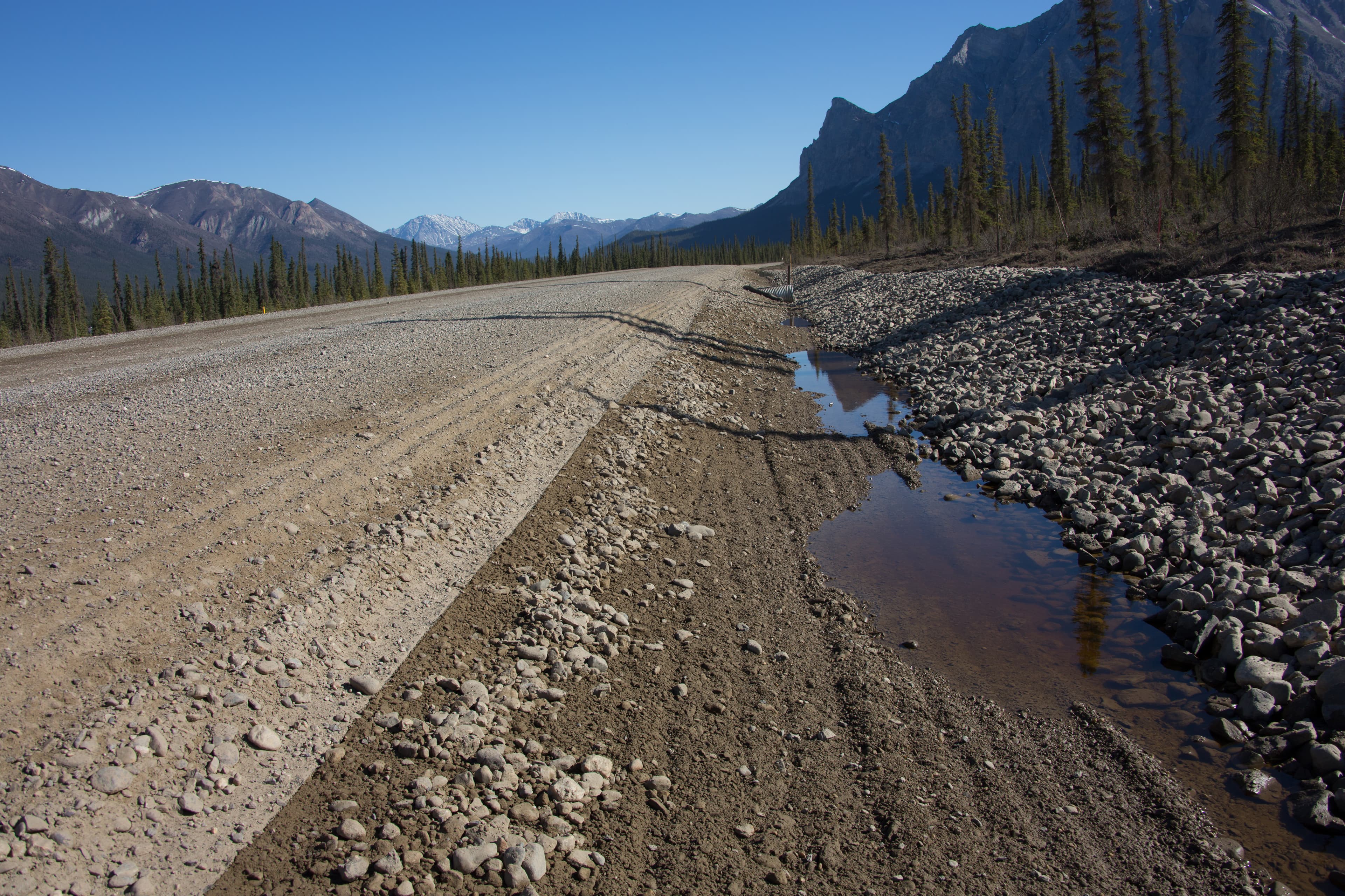 The Dalton Highway in Alaska, one of the most isolated roads in the United States, supports a significant amount of truck traffic. It is the sole ground transportation route connecting the oil fields at Prudhoe Bay with Fairbanks. This 500-mile (805-kilometer) highway experiences degradation due to the extreme northern environment, particularly from frost heave and thaw weakening. A notable problem area was at Milepost 110, known as Beaver Slide. Here, severe deterioration occurred during the spring thaw due to shallow groundwater running downslope under the highway on an 11% grade. This water pooled in the road embankments, causing frost boils that lead to road damage.