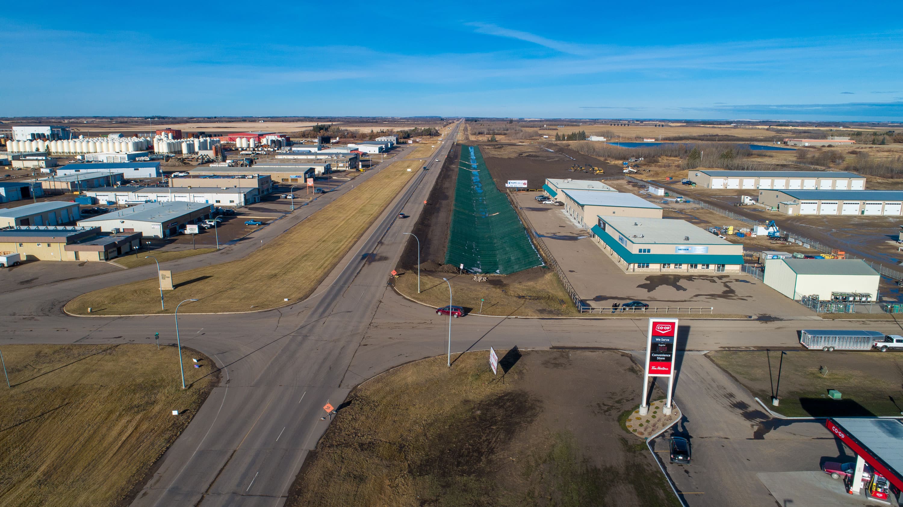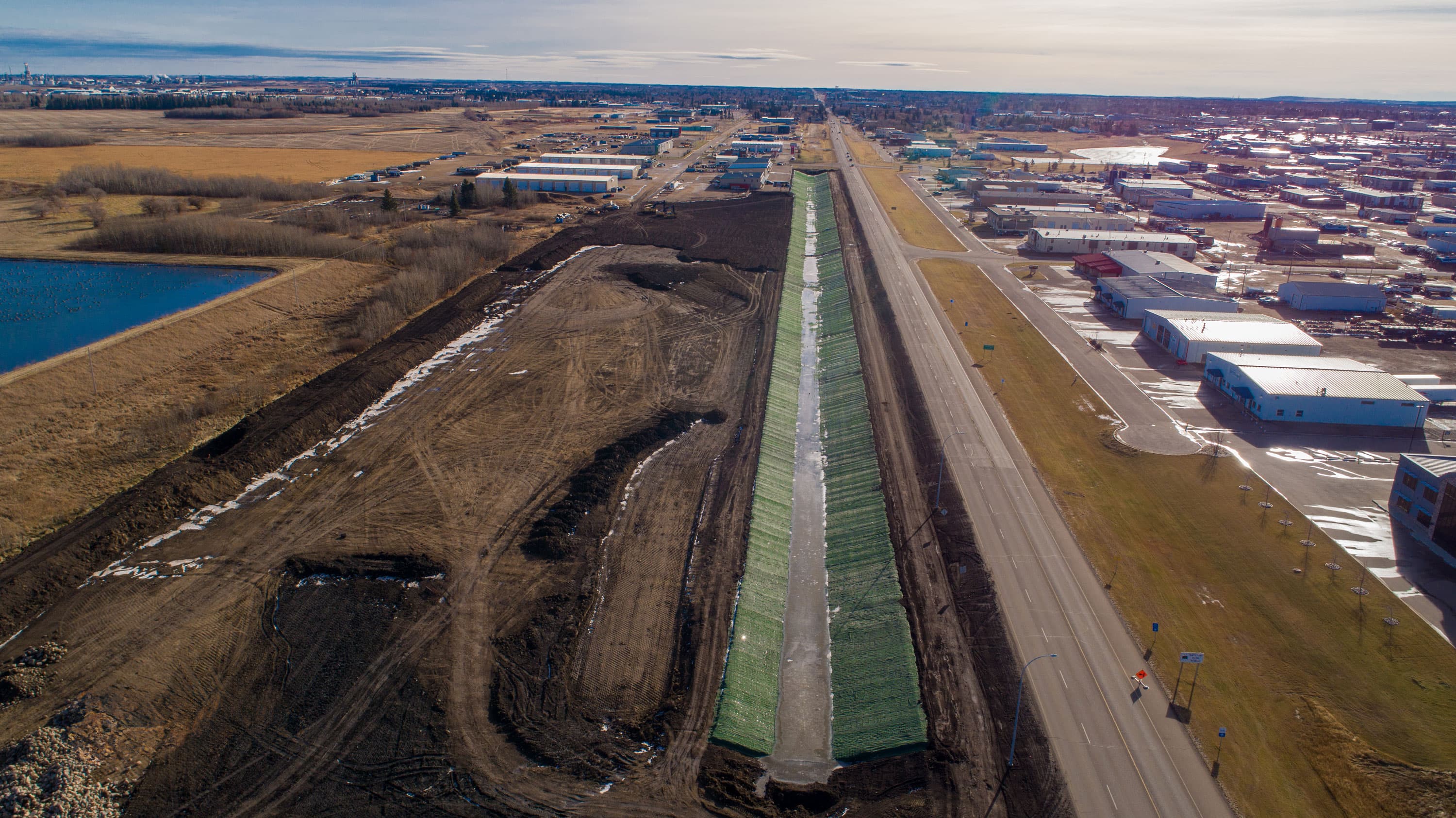 The Northwest Drainage Channel in Lloydminster, Alberta, required significant enhancements to the grading and capacity of the existing channel. Originally, the natural channel was 1.5 m (4.9 ft) wide, shallow, and lacked the capacity to manage the water flow from a storm event that occurs once in ten years. This insufficiency led to water spilling over onto an adjacent road and causing flooding in nearby businesses. To address this, Resource Management International Inc. expanded the channel's width to 5 m (16.4 ft), enhancing its capacity for higher water flows. The redesign also included long-term erosion protection capable of withstanding a 100-year flood event.