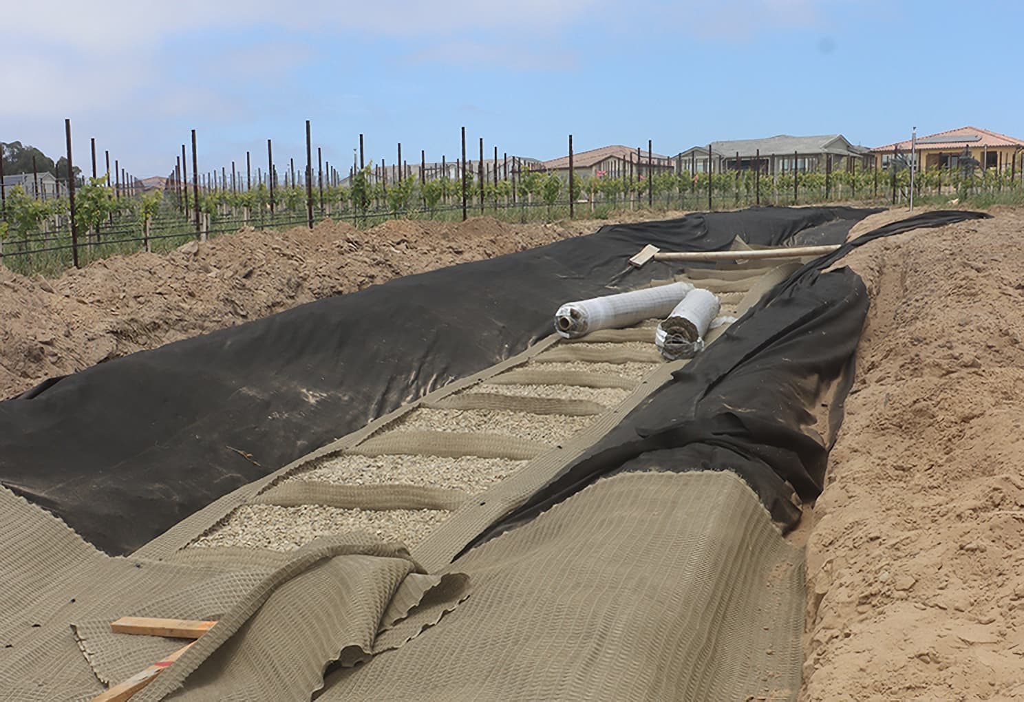 Monarch Dunes is a resort community that offers residents golf, recreation, and a community vineyard. During construction, a drainage channel was installed in the vineyard to convey surface runoff from the housing development to detention storage basins. Due to the steepness of the slope, the amount of flow, and the erodible sandy soils, the channel severely eroded and failed. The developer needed a solution to provide long-term stabilization of the channel.